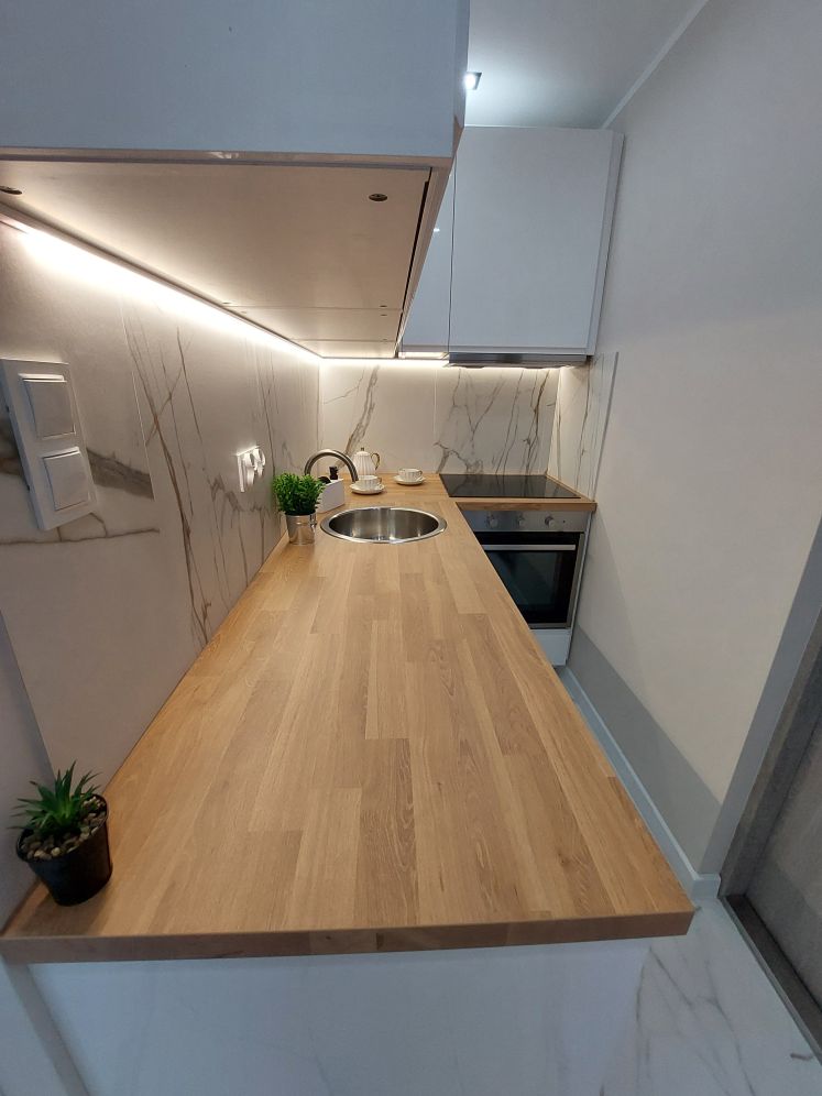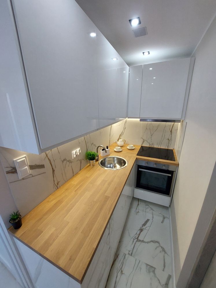 nowoczesna zabudowa kuchenna wraz z kompletnym sprzętem AGD (piekarnik, płyta, okap, lodówka),